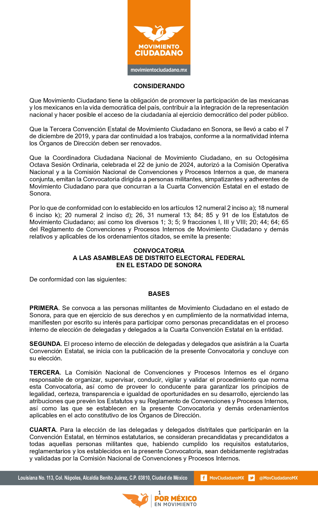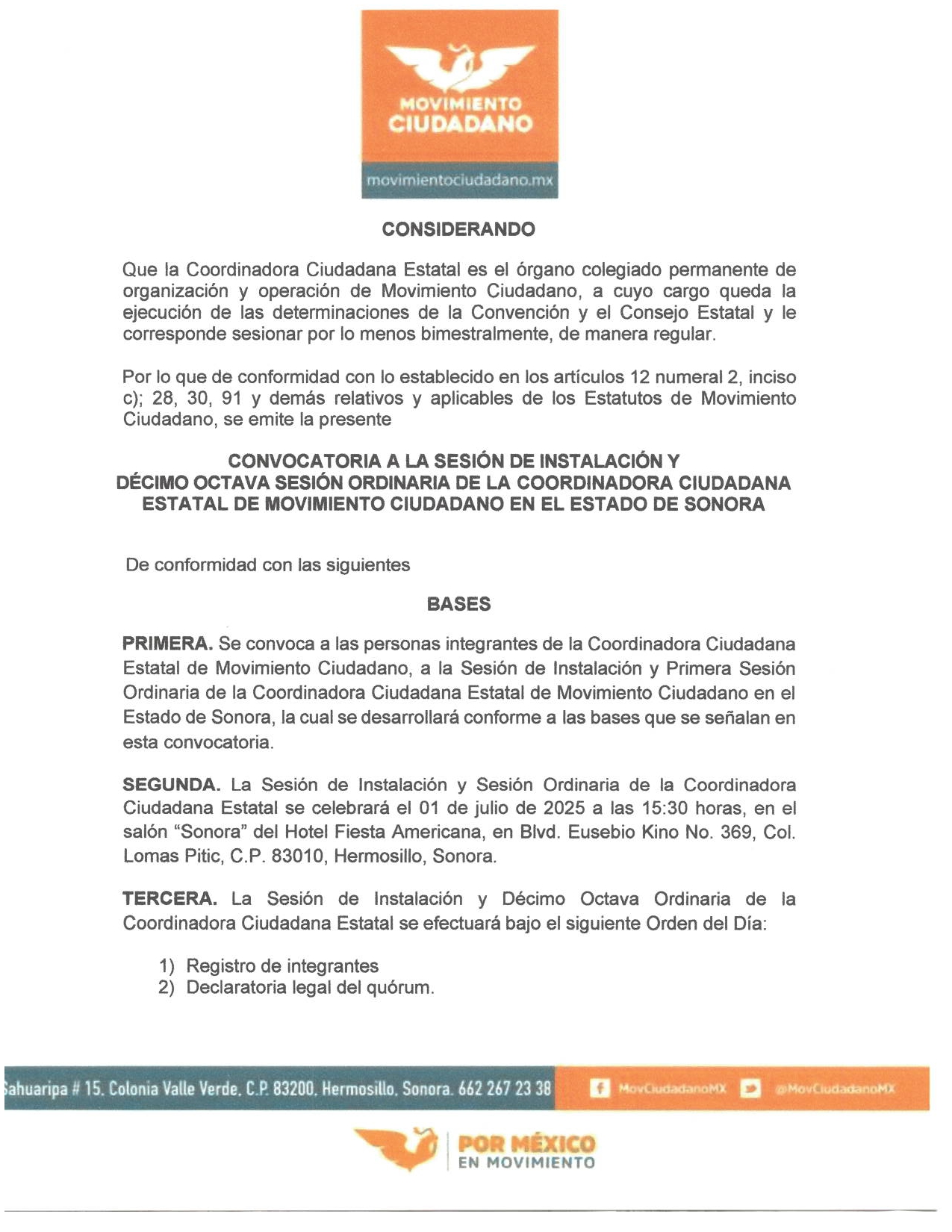 CONVOCATORIA A LA SESIÓN DE INSTALACIÓN Y DÉCIMO OCTAVA SESIÓN ORDINARIA DE LA COORDINADORA CIUDADANA ESTATAL DE MOVIMIENTO CIUDADANO EN EL ESTADO DE SONORA