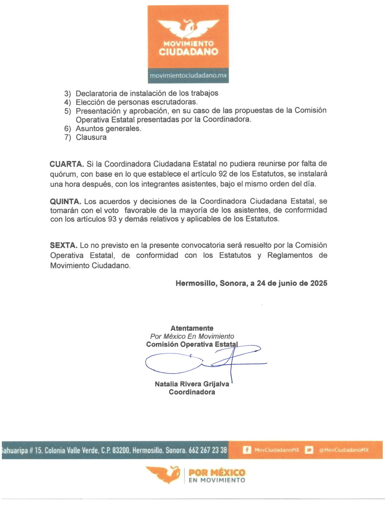 CONVOCATORIA A LA SESIÓN DE INSTALACIÓN Y DÉCIMO OCTAVA SESIÓN ORDINARIA DE LA COORDINADORA CIUDADANA ESTATAL DE MOVIMIENTO CIUDADANO EN EL ESTADO DE SONORA