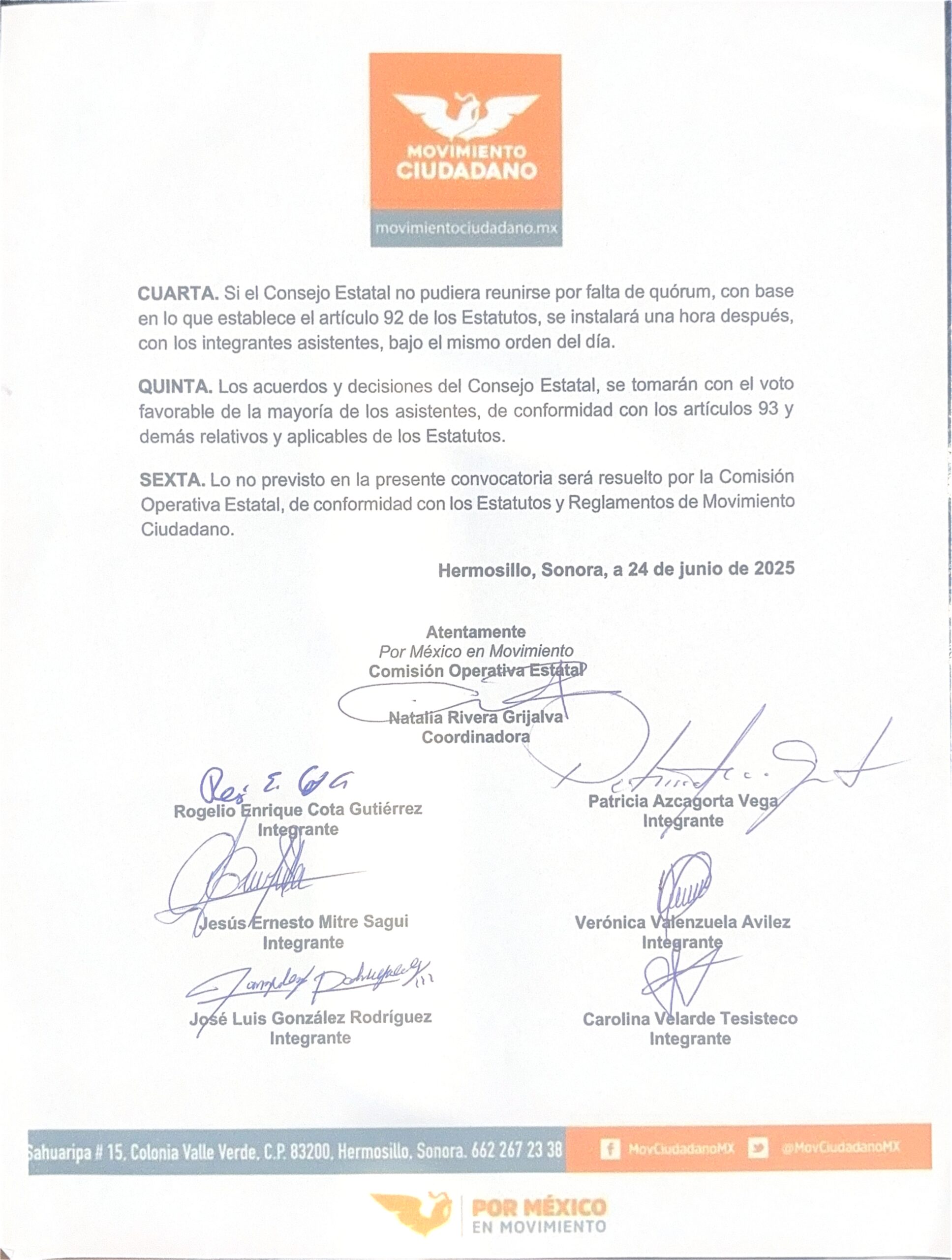 CONVOCATORIA A LA SESIÓN DE INSTALACIÓN Y SÉPTIMA ORDINARIA DEL CONSEJO ESTATAL DE MOVIMIENTO CIUDADANO EN SONORA